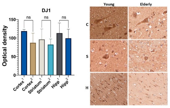 Figure 6. Results of DJ1 immunohistochemical staining: 1—young group, 2—elderly group; C—cortex, S—corpus striatum, H—hippocampus. ns—differences are not statistically significant (p > 0.05). Magnification 400× for “C” and “S”, Magnification 200× for “H”.