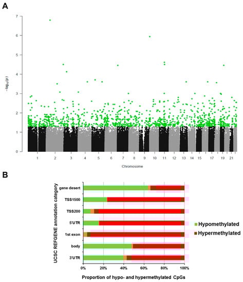 DMPs in EPIC HD. (A) Manhattan plot of genome-wide Benjamini Hochberg-corrected p-value distribution of 450K CpG methylation difference in EPIC samples. p-values of differential methylation in 63 pre-diagnostic lung cancer case versus healthy control blood sample pairs are plotted. Green dots indicate 1106 statistically significant probes below the BH corrected p-value threshold of 0.05. (B) Relative proportions of hypo- and hypermethylated CpGs by genomic context from the 1106 statistically significantly differentially methylated CpGs in EPIC HD. Annotation categories: gene deserts (none), up to 1500 bp (TSS 1500) or up to 200 bp (TSS 200) upstream of a transcription start site, 5′ untranslated region of a gene (5′UTR), first exon (1st exon), gene body (body) or the 3′ untranslated region (3′UTR).