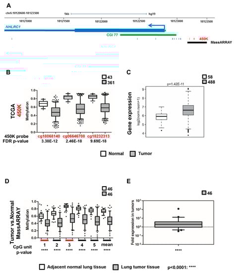NHLRC1 DNA methylation and mRNA expression in lung adenocarcinomas. (A) Genomic location of the NHL repeat containing 1 (NHLRC1) gene. 256 bp region tested by MassARRAY and the 450K CpG probe positions are indicated. Red ticks depict differentially methylated 450K probes. (B) In silico TCGA tumor versus normal 450K data analysis for ADC for the candidate and 2 adjacent CpGs in the NHLRC1 DMR. False discovery rate (FDR) corrected p-values are displayed. (C) NHLRC1 gene expression of TCGA tumor versus normal data. (D) MassARRAY in 94 paired lung tumor versus 94 adjacent normal lung samples to determine DNA methylation of all CpGs in a 256 bp region displayed as CpG units. Red lines indicate those CpG units containing the CpGs which were originally identified as differentially methylated in EPIC and TCGA. Two-tailed t-test p-values. (E) NHLRC1 mRNA expression analysis by real-time PCR in 92 samples of the lung tumor versus adjacent normal sample set. Whiskers indicate 5–95 percentile. Two-tailed t-test p-values, ****: p < 0.0001.