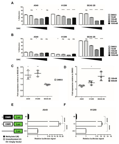 A549, H1299 and BEAS 2B were treated with 0.01-1 µM 5-Aza-2′-deoxycytidine (Decitabine—DAC; Sigma Aldrich) or DMSO (Thermo Scientific) for 72 h with cell culture media replacement every 24 h. Pyrosequencingof long interspersed elements such as LINE1 confirmed treatment efficacy by DNA methylation loss.