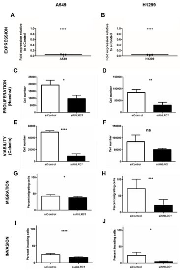 Since NHLRC1 was overexpressed in tumor tissue, we aimed to characterize NHLRC1 functions in more detail. To do this, we performed RNAi mediated knock-down (KD) of NHLRC1 in A549 and H1299 cells with highly specific siRNA pools []. NHLRC1 siRNA KD was confirmed by rtPCR (Figure 4A,B). We measured numbers of proliferating and viable cells 96 h post-transfection. NHLRC1 KD cells proliferated less (Figure 4C,D) and were less viable compared to control-treated cells (Figure 4E,F). In addition, NHLRC1 KD attenuated transwell lung cancer cell migration (Figure 4G,H) and basement membrane invasion (Figure 4I,J). In brief, the overexpression of NHLRC1 in tumor cells is associated with higher proliferation rates with an increased ability for migration and invasion, which is characteristic for cancer cells.