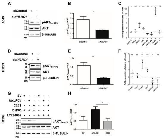 NHLRC1 coding region (Supplementary Table S2) was cloned into the pCRII-cGFP backbone expressing a GFP independently of the insert as transfection control. NHLRC1 C26S catalytic mutant was generated with Quikchange XL II site-directed mutagenesis kit (Agilent, Santa Clara, CA, USA) according to the manufacturer’s instructions (Supplementary Table S2). Correct sequences were checked by Sanger sequencing (Eurofins MWG Operon, Ebersberg, Germany). We transiently transfected H1299 cells using Lipofectamine3000 transfection reagent (Thermo Scientific) according to the manufacturer’s instructions for 36 h. Cells were treated with 50 µM LY294002 PI3K inhibitor (Cell Signalling Technology, Danvers, Massachusetts, U.S.; CST) or DMSO (Thermo Scientific) control for 1 h prior to protein isolation.