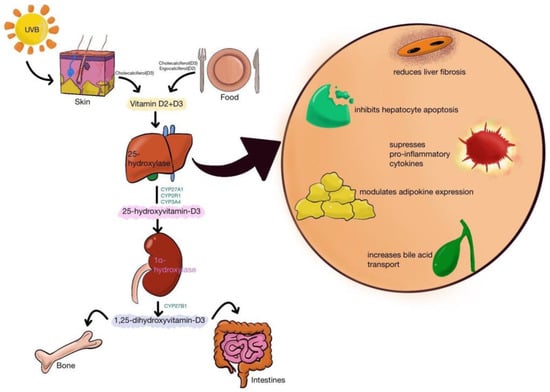 Vitamin D3 and D2 interfere with many detoxification processes in the liver by stimulating P450 cytochromes expression (i.e., CYP3A4, CYP2B6, and CYP2C9) and promoting normal liver recovery after partial hepatectomy by increasing intracellular calcium flow, control DNA polymerase α activity, and nuclear protein kinase activity. VDRs are localized in the cell nucleus and are found in most body tissues, like the liver, kidney, thyroid, adrenal glands, gastrointestinal tract, breast, or skin. One of the most important roles of VDR is to inhibit CYP7A1 mRNA expression and bile acid synthesis, thereby protecting hepatocytes against cholestasis []. Vitamin D has important antiproliferative and antifibrotic effects on liver fibrosis by inhibiting the expression of proliferation and profibrotic markers in hepatic stellate cells and excessive deposition of extracellular matrix components [].