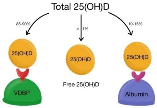 Total 25(OH)D in serum is bound to vitamin D binding protein (VDBP), 85–90%; albumin, 10–15%; and <1% circulates free. Bioavailable vitamin D refers to vitamin D3 and D2, which are not bound to VDBP (Adapted from Fernando M, []).