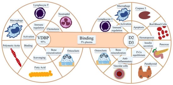 The roles of vitamin D2 and D3 and VDPB. Only 5% of VDBP is found in plasma, bound by 25(OH)D, the main active metabolite of VD2 and VD3 subunits. The rest of the 95% is found in different tissues and organs where different functions are performed. An important anti-inflammatory roll, through the different effects on lymphocytes, macrophages, or neutrophils, regulates lipid metabolism by binding fatty acids and significantly reducing the risk for atherosclerosis or insulin resistance, prevents disseminated intravascular coagulation by stimulating actin degradation, or regulates bone resorption by stimulating osteoclast activity. Vitamin D2 and D3m through their metabolites, perform a lot of functions in bone mineralization; autoimmune disorders or different cancers; anti-infective defense by its anti-inflammatory role; and protection against obesity, diabetes mellitus, atherosclerosis, non-alcoholic fatty liver disease, liver fibrosis, or multiple sclerosis [,,,,,,,,,,].