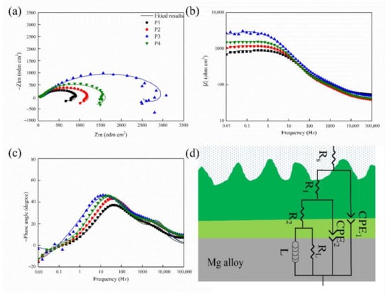 | Sample | Rs (ohm·cm2) | CPE1 (μF·cm−2) | n1 | R1 (ohm·cm2) | CPE2 (μF·cm−2) | n2 | R2 (ohm·cm2) | RL (ohm·cm2) | L (H·cm−2) |