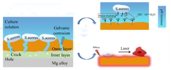 - Tan, J.; Wang, D.; Cao, H.; Qiao, Y.; Zhu, H.; Liu, X. Effect of Local Alkaline Microenvironment on the Behaviors of Bacteria and Osteogenic Cells. ACS Appl. Mater. Interface 2018, 10, 42018–42029. [Google Scholar] [CrossRef]