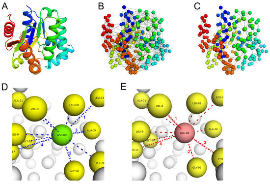 We represented the wildtype and mutant protein structures as coarse-grained systems where each residue was represented by its alpha carbon. Additionally, we represented the mutant protein structures by replacing the wildtype residues with their respective mutant residues at the alpha carbon position. We then took a similar approach using GNM to simulate protein unfolding and identify the sequence of residue–residue contacts broken during unfolding, as previously described by Su et al. [