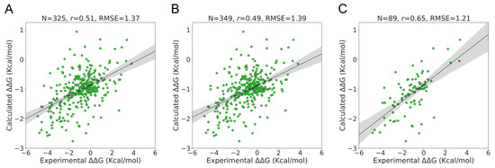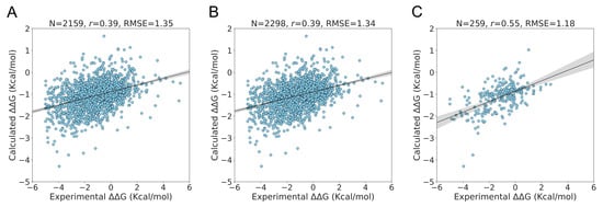 Figure 4B) datasets, we do not observe a considerable reduction in the agreement with experimental ΔΔG when assigning a PSP-GNM-calculated ΔΔG value of 0 for such cases.