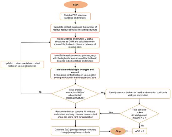 To simulate partial protein unfolding, the residue–residue contacts with the highest mean-squared fluctuations (MSFs) in their distance are first identified, both in the wildtype and mutant proteins. In this context, MSF is the average change in internal distance for a given pair of residues. These contacts are then removed from the amino acid contact matrices of the wildtype and mutant. The new contact matrix is then used for MSF calculations in the next iteration, and the same procedure of identifying and removing the contacts with the highest MSF is followed. We refer to this method of sequentially identifying high-MSF contacts and removing them as protein unfolding. Previous studies have successfully used this approach to study protein unfolding behavior [