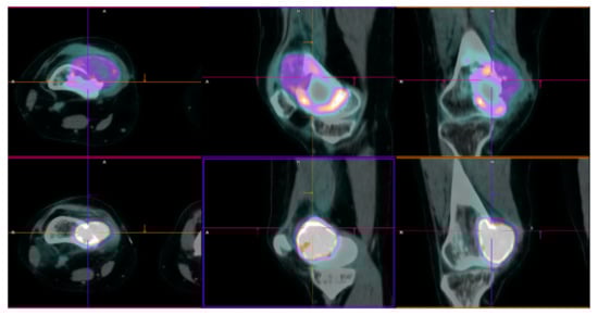 The GCTB biological behaviour has posed the problem of achieving correct diagnostic and therapeutic management; thus, several staging systems have been proposed over the years. Three grades Campanacci’s classification is based on conventional radiography findings: grade one (latent) relates to a lesion with a well-defined margin, presence of sclerotic border and absence of cortical involvement; in grade two (active), the tumour has well-defined margins but no peripheral sclerosis, with thinned cortical and bone remodelling; in the third grade, the lesion shows indistinct edges, soft tissue infiltration, and erosions of the cortex []. Computed tomography (CT) is the method of choice for better delineation of cortical alterations, as it enables multiplanar evaluation and differentiation of solid, necrotic, and cystic components due to the administration of intravenous contrast medium. The magnetic resonance (MR) imaging findings are nonspecific, usually consisting of low/intermediate signal in T1-weighted images and high signal in T2-weighted images that can be variably dishomogeneous due to the fibrous components and the cystic parts. Intravenous gadolinium administration usually shows heterogeneous enhancement of the lesion and permits the differentiation between the cystic and solid components, and MRI is the method of choice to demonstrate tumour extension to the adjacent joint and soft tissue. The radiographic features of primary malignant GCTB are often identical to those of a giant benign cell tumour of bone, and in most cases, it has been impossible to distinguish primary malignant GCTB from a benign lesion on plain films [,]. Low Campanacci stage (stage 1) is the only clear distinguishing feature for benign GCTB. CT and MRI have also failed to provide specific signs []. Secondary malignant GCTB is difficult to differentiate from recurrent benign GCTB radiologically, but in most cases the presence of Campanacci grade III at the time of diagnosis, with cortical permeation and an associated soft-tissue mass, could reflect its aggressive behaviour []. Although the diagnosis of malignant GCTB appears difficult ab initio, some radiological changes of the lesion that occur during the follow-up can lead to suspicion of a malignant transformation []. Unfortunately, no uniform imaging assessment criteria have been approved to specifically evaluate the response to denosumab treatment in GCTB. The principal signs assessed by MRI or CT, indicative of positive response to denosumab treatment, are usually an increased radiopacity within the area of tumour osteolysis, for the appearance of osteosclerosis, and the construction of marginal neocortex. Considering that, the absence of these peculiar markers and the increase in size of soft-tissue mass during treatment and follow-up, should suggest an aggressive behaviour of benign GCTB, reasons to justify further investigations. The use of 18F-Fluorodeoxyglucose (FDG) positron emission tomography/computed tomography (18F-FDG PET/CT) to assess GCTB response to denosumab treatment is increasing over time. Indeed, the significant reduction in FDG avidity during therapy, which occurs in over 90% of patients, appears to be the most sensitive method for evaluating treatment efficacy and tumour control over time, compared with size/density variation on CT [,,]. In addition, the development of new bone formation can be assessed on the co-registered CT scan. Unlike other benign bone conditions, the peculiarly high FDG avidity of GCTB does not allow the suspicion of malignant transformation merely on the basis of tumour FDG uptake (Figure 1).