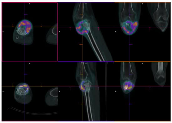The GCTB biological behaviour has posed the problem of achieving correct diagnostic and therapeutic management; thus, several staging systems have been proposed over the years. Three grades Campanacci’s classification is based on conventional radiography findings: grade one (latent) relates to a lesion with a well-defined margin, presence of sclerotic border and absence of cortical involvement; in grade two (active), the tumour has well-defined margins but no peripheral sclerosis, with thinned cortical and bone remodelling; in the third grade, the lesion shows indistinct edges, soft tissue infiltration, and erosions of the cortex []. Computed tomography (CT) is the method of choice for better delineation of cortical alterations, as it enables multiplanar evaluation and differentiation of solid, necrotic, and cystic components due to the administration of intravenous contrast medium. The magnetic resonance (MR) imaging findings are nonspecific, usually consisting of low/intermediate signal in T1-weighted images and high signal in T2-weighted images that can be variably dishomogeneous due to the fibrous components and the cystic parts. Intravenous gadolinium administration usually shows heterogeneous enhancement of the lesion and permits the differentiation between the cystic and solid components, and MRI is the method of choice to demonstrate tumour extension to the adjacent joint and soft tissue. The radiographic features of primary malignant GCTB are often identical to those of a giant benign cell tumour of bone, and in most cases, it has been impossible to distinguish primary malignant GCTB from a benign lesion on plain films [,]. Low Campanacci stage (stage 1) is the only clear distinguishing feature for benign GCTB. CT and MRI have also failed to provide specific signs []. Secondary malignant GCTB is difficult to differentiate from recurrent benign GCTB radiologically, but in most cases the presence of Campanacci grade III at the time of diagnosis, with cortical permeation and an associated soft-tissue mass, could reflect its aggressive behaviour []. Although the diagnosis of malignant GCTB appears difficult ab initio, some radiological changes of the lesion that occur during the follow-up can lead to suspicion of a malignant transformation []. Unfortunately, no uniform imaging assessment criteria have been approved to specifically evaluate the response to denosumab treatment in GCTB. The principal signs assessed by MRI or CT, indicative of positive response to denosumab treatment, are usually an increased radiopacity within the area of tumour osteolysis, for the appearance of osteosclerosis, and the construction of marginal neocortex. Considering that, the absence of these peculiar markers and the increase in size of soft-tissue mass during treatment and follow-up, should suggest an aggressive behaviour of benign GCTB, reasons to justify further investigations. The use of 18F-Fluorodeoxyglucose (FDG) positron emission tomography/computed tomography (18F-FDG PET/CT) to assess GCTB response to denosumab treatment is increasing over time. Indeed, the significant reduction in FDG avidity during therapy, which occurs in over 90% of patients, appears to be the most sensitive method for evaluating treatment efficacy and tumour control over time, compared with size/density variation on CT [,,]. In addition, the development of new bone formation can be assessed on the co-registered CT scan. Unlike other benign bone conditions, the peculiarly high FDG avidity of GCTB does not allow the suspicion of malignant transformation merely on the basis of tumour FDG uptake (Figure 1).