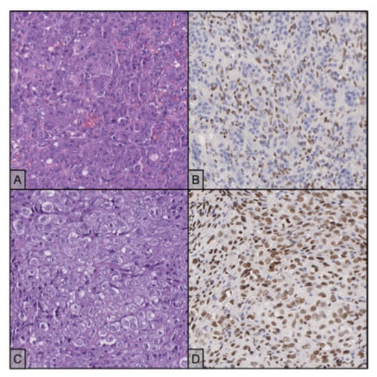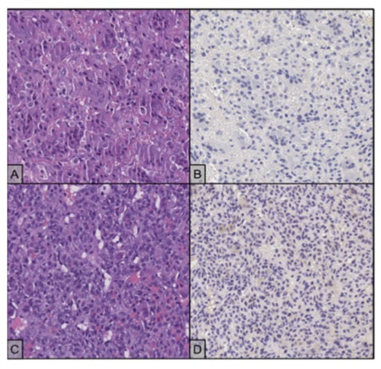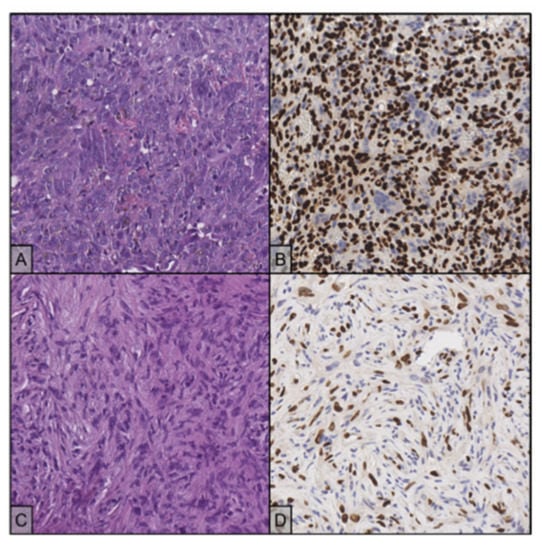 In July 2017, for persistent right knee pain, a 29-year-old woman performed clinical and diagnostic exams, including an MRI that showed the presence of an osteolytic lesion of the distal femur with sharp, sclerotic margins, without apparent interruption of the cortical bone and/or involvement of the perischeletric soft tissues (Figure 3A,B). In August, the patient underwent bioptic procedure of the osteolytic lesion at the right distal femur. On microscopic examination, the lesion (Figure 4A) showed a proliferation of osteoclast-like giant cells admixed with mononuclear cells. A pathological diagnosis of GCTB was formulated. After discussion with our MDT, the patient underwent intralesional surgery with curettage of the lesion and bone grafting. Subsequent follow-up was negative until January 2018, when a 18F-FDG-PET showed focal hypermetabolism compatible with relapse of the disease in the femoral shaft (standardised uptake value (SUV) max 11.1; Figure 1) and an involvement of soft tissues at the distal third of the right thigh. Furthermore, MRI confirmed the presence of an oval lesion (6.9 × 4.7 × 5.9 cm) at the antero-medial level of the distal right femur, compatible with local regional relapse (Figure 3C,D). A biopsy of the suspect lesion was performed, and histological analysis confirmed GCTB diagnosis, including a higher degree of atypia of the neoplastic cells and depletion of the giant cells. For these reasons, the patient started neoadjuvant treatment with denosumab with close clinical and radiological monitoring. The treatment with denosumab was continued for about 4 months until May 2018, when a new CT scan showed a significant increase in soft tissue in the perischeletrical area with calcified concamerations. Therefore, the patient underwent an extraarticular resection of the right knee and subsequent reconstruction with a silver modular oncological prothesis. Histological analysis showed unequivocal features of malignancy, with the neoplasm consisting of markedly atypical spindle cells diffusely infiltrating the native bone. A diagnosis of secondary malignant GCTB with transformation into fibroblastic osteosarcoma was initially formulated. Consequently, since November 2018, the patient was treated with adjuvant chemotherapy including high-dose methotrexate, adriamycin, and cisplatin (MAP regimen) for 27 weeks plus mifamurtide []. The follow up was negative until November 2020 when, after continuous pain in the proximal right humerus, a 18F-FDG-PET showed a pathological alteration of the right humerus (SUV max 7.2) and a subsequent MRI showed a proliferative lesion of the osteogenic mesenchymal series at the level of the right humerus. Considering the presence of only one suspicious lesion, a histological confirmation with biopsy was needed. The histological examination of the lesion (Figure 4C) showed a crowded proliferation of atypical, round cells in the context of a richly vascularised stroma, with no giant cells. Meanwhile, immunostaining for the H3-3A mutation was performed, giving negative results (Figure 4D) []. The neoplastic lesions were instead immunoreactive for SATB2, a marker of osteoblastic differentiation, and a final diagnosis of osteosarcoma was, therefore, formulated. After this, the patient was treated with ifosfamide as first line, with gemcitabine-docetaxel as second line and subsequently with pazopanib, until her death in January 2022 [,,,]. The OS was 53 months from first GCTB diagnosis, 43 months from malignant histopathological transformation, and with a time to malignant transformation of 9 months. In the context of this study, a retrospective review of the histological slides for all the subsequent bioptic and surgical samples was performed, along with the immunohistochemistry for H3F3A. All lesions, including the older one (Figure 3B) tested negative for H3F3A and positive for SATB2, a finding suggesting molecular features of giant-cell-rich osteosarcoma from the beginning, despite the morphological pattern apparently suggestive of benign GCTB.
