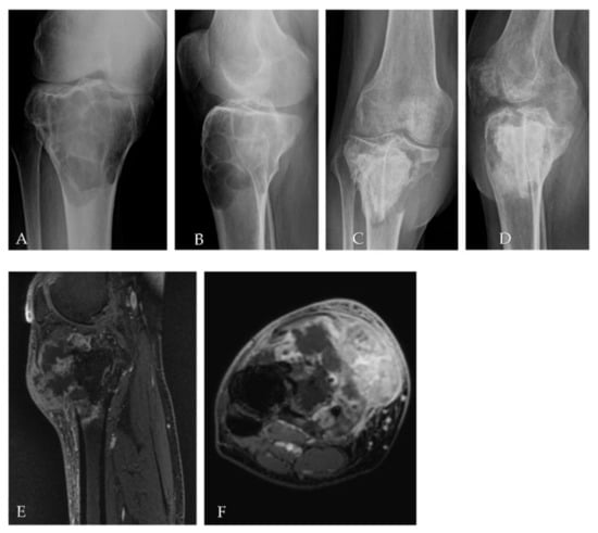 (A,B) The RXs of the right knee performed at time of initial diagnosis, showed a large, well-defined osteolytic lesion involving the tibial plateau and the proximal third of the tibial shaft, with thinning of the cortical bone. The RX (C,D) of the right leg performed after neoadjuvant treatment with denosumab showed the presence of a lytic alteration of the proximal meta-epiphyseal region with interruption of the cortical bone on the medial aspect of the right tibia; an MRI (E,F) confirmed the present of solid inhomogeneous tissue in the meta-epiphyseal of the tibia with significant involvement of extraskeletal soft tissue.