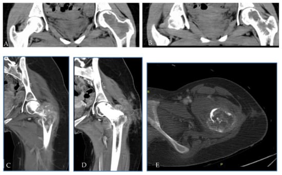 (A,B) At time of diagnosis, CT scan showed a well-defined osteolytic lesion of the head and neck of the left femur with integrity of cortical bone. (C–E) During the follow up, for the occurrence of a pathological fracture, CT scan showed a large, complex area of osteostructural alteration of the neck and femoral shaft composed of solid vascularised tissue widely extended in perifemural tissue.