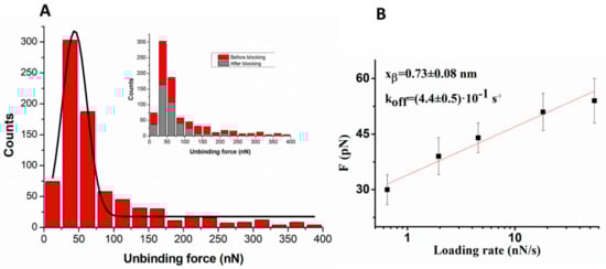 (A) Histogram of the unbinding forces for the HSA/miR-155 complex from AFS measurements carried out at a loading rate of 4.6 nN/s. The most probable unbinding force value (F*) has been determined from the maximum of the main peak of the histogram by fitting with a Gaussian function (black curve). Inset: Histogram of the unbinding forces for the HSA/miR-155 complex before and after blocking, at the same loading rate. (B) Plot of the most probable unbinding force, F*, vs. the logarithm of the loading rate for the HSA/miR-155 complex. The red continuous line is the best fit by the Bell–Evans model with Equation (1); the extracted values for the koff and xβ parameters are reported.