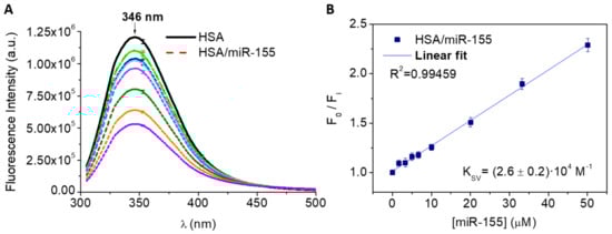 (A) Fluorescence quenching of 5 µM HSA in Tris-HCl buffer, pH 7.0, upon titration with miR-155 (1.5–50 µM); emission spectra have been collected using λexp = 295 nm, at 298 K. (B) linear fitting of the fluorescence intensity as a function of miR-155 concentration according to Equation (2); the extracted KSV value being reported. The arrow indicates the peak of the spectra, while the bars indicate the errors.