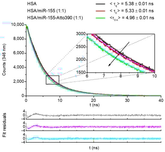 (Top): Time-resolved fluorescence decays of HSA, of the D (Donor) complex HSA/miR-155 (1:1), and of the DA (Donor-Acceptor) complex HSA/miR-155–Atto390 (1:1), acquired using λexc = 295 nm and λem = 346 nm, at 298 K; c = 5 µM in Tris-HCl buffer, pH 7.0. The respective average fluorescence lifetimes (<τ>), extracted by fitting the decays according to Equations (3) and (4), are reported. (Bottom): weighted fit residuals.