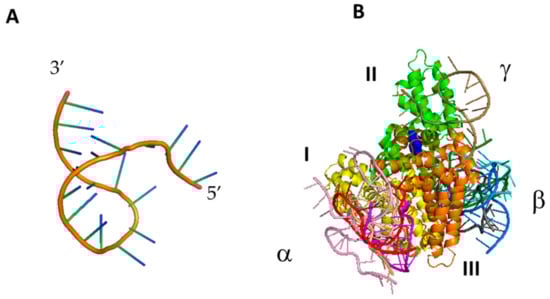 Graphical representation of: (A) model for miR-155. (B) Collective representation of the ten best models for the HSA/miR-155 complex. Regarding HSA, domain I is colored in yellow, domain II in green and domain III in orange; Trp214 being shown as blue spheres. The three possible binding sites of HSA for miR-155 are indicated by α, β and γ.