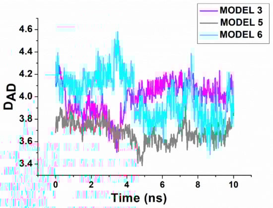 To investigate the stability of these models, and also to discriminate among them by evaluating the binding free energy, they have been submitted to a MD simulation, constituted by a preliminary equilibration of 3 ns, followed by a 10 ns long run for data collection (with five replicates for each model). The temporal evolution of the all-atoms RMSD for the various runs of the three models exhibits an initial increase, followed by an almost constant trend around values ranging between 0.35–0.45 nm. Such a behavior indicates the substantial stability of the formed complexes in the analyzed temporal window. Representative examples of DDA during the 10 ns long trajectories for the three models are shown in Figure 5. We note fast fluctuations on which some jumps are superimposed; the latter indicating a local re-organization of the ligand at the binding site. Similar trends have been observed for the other runs. The average distances evaluated over all the MD runs for each model are reported in Table 1. In all cases, the distance does not significantly deviate from the initial value, consistently with the permanence of the ligand within the receptor site.