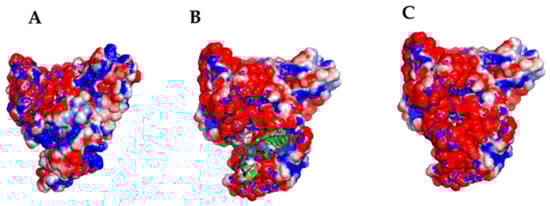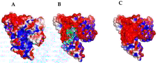The resulting binding free energy is negative for all three models, and then all of them can be assumed to be energetically favorable, with Models 3 and 5 binding in almost the same HSA region with a similar topography. Remarkably, such a binding site coincides with that involved in the HSA/miR-4749 complex. Since Model 5 is characterized by a lower binding free energy than Model 3, we have submitted it to further analysis together with Model 6, in which, instead, miR-155 engages a different site of HSA. In particular, we closely addressed the role of the electrostatic forces in the complex formation by evaluating the electrostatic surface potential by the Adaptive Poisson–Boltzmann Solver (APBS) for these two models with a time step of 0.1 ns []. The final electrostatic surface potential for a representative structure of Models 5 and 6 for the complex, is shown in Figure 6 and Figure 7, respectively.
