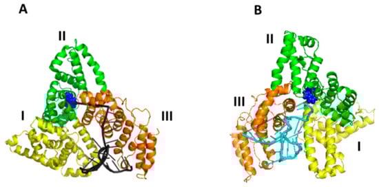 Graphical representation of the two proposed best models for the complex between HSA and miR-155: (A) Model 5 with miR-155 represented in grey; and (B) Model 6, with miR-155 represented in cyan. In HSA, domain I is colored in yellow, domain II in green and domain III in orange; Trp214 is shown as blue spheres. The distance DDA between Trp146 and the 5′ end of miR-155 and the center of the aromatic rings of the lateral chain of Trp214 of HSA is marked by gray dashed lines.