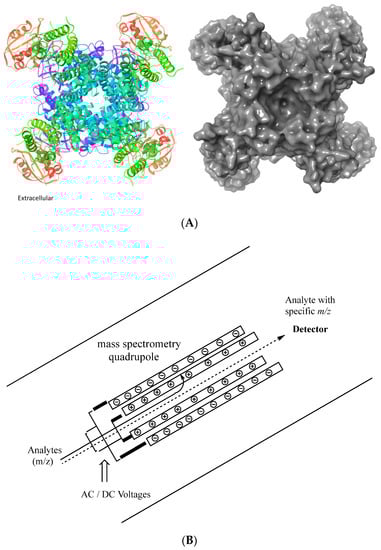 (A) Representative depiction of an extracellular view of a voltage-gated potassium channel. Ribbon representation of the hERG channel. The image was generated using Schrӧdinger Maesto and importing the PDB: 5VA1 3.70 Å structure [], including the biological unit. The ribbons are colored by residue position using the default palette in Schrӧdinger Maestro. (B) Representative sketch of a mass spectrometry quadrupole.