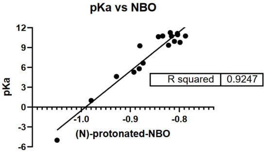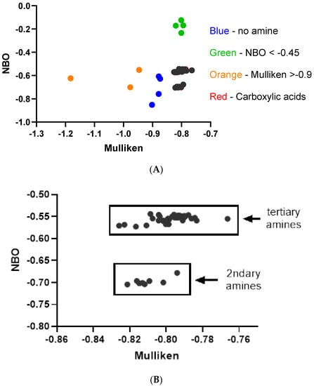 There are a variety of ways to computationally generate atomic charges []. The three different methods that were computed in this manuscript include: (1) the Mulliken population analysis that will partition the total +1 molecular charge amongst the atoms within the molecule; (2) the natural population analysis (NBO) which uses core electrons, valence electrons, and electrons located in diffuse functions to partition the charge on the nitrogen; and (3) the Merz–Kollman–Singh (MKS) method which assigns point charges to fit the computed electrostatic potential to points on concentric spheres around each atom. Out of the three methods, the Mulliken and NBO were found to be more informative than the MKS. Regarding the Mulliken Population Analysis, Mulliken charges provide a way to estimate partial atomic charges from calculations carried out by computational chemistry via a linear combination of atomic orbitals (LCAO), a molecular orbital method routinely used as variables in linear regression, whereas the NBO analysis is based on a method that optimally transforms a given wave function into a localized form which corresponds to Lewis structure pictures where one has lone pairs and chemical bonds.
