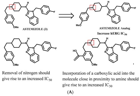 The current work adds value to the preclinical safety/medicinal chemistry interface, as one can make rational drug design suggestions about how to modify an NCE that possesses serious hERG liabilities to relieve the potential safety concern that accompanies an hERG inhibitor. At the same time such modifications must strike a balance; one does not want to compromise the desired potency and other ADME properties of the NCE while optimizing the safety profile. Consequently, one could take different strategies, as proposed per the examples presented in Figure 4A, where astemizole (3; 0.001 μM)—a very potent hERG inhibitor—is predicted to have a statistically significant shift in the IC50 by removing a methylene -CH2- and thus affording a ‘field effect’ which should result in an increased IC50 (better safety profile) as compared to the parent astemizole. A similar safety improvement might be achieved by substituting the protonated nitrogen with a carbon atom. This modification would help to distinguish the importance of the amine functionality from the contributions of the aromatic skeleton. Lastly, one could incorporate a carboxylic acid into the molecule which should also give an increased hERG IC50.