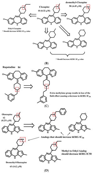 Examples of hERG interaction trend predictions, (A) Astemizole template. Removal of the -CH2- should give rise to a molecule whose protonated nitrogen undergoes a ‘field effect’ and thus should give rise to a molecule that has a higher hERG IC50. (B) Clozapine template. (C) Rupatadine template. (D) Olanzapine template.