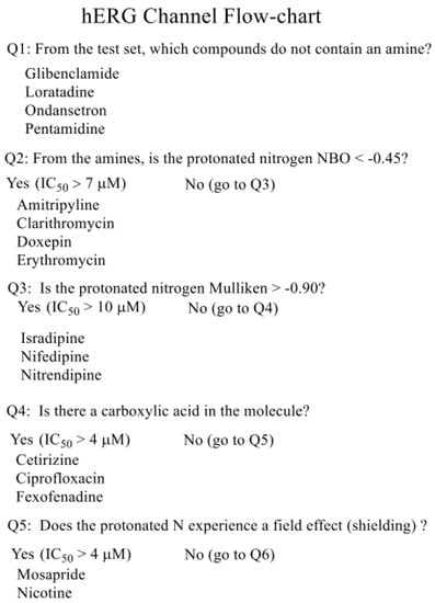 Q3: Nicarpidine (80) in the test set exhibits a protonable nitrogen with a Mulliken value -0.90 and thus has an estimate of >10 μM. Proceeding to question 4, the following compounds of the test set have a carboxylic acid moiety and therefore are predicted to have an IC50 greater than 6.0 μM: bilastine (56; 6–17 μM); carebastine (61; estimated at > 6.0 μM); 2-carboxy-methyl-olanzapine (65; estimated at >6.0 μM); gatifloxacin (73; 50 μM); levofloxacin (75; 915 μM); and sparfloxacin (89; 18 μM).