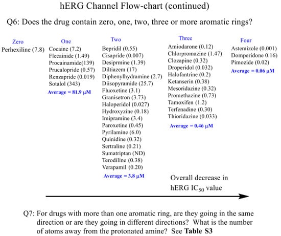 Next, the alkyl environment around the amine was assessed. The compounds with two or more aromatic rings in the compound trigger the question: ‘are the aromatic rings going in the same or different directions, and what connectivity may they exhibit?’ (Q7). These considerations are summarized in Table S3 for the compounds that have two, three, and four aromatic groups, with their N-alkyl environment, relative distance from the amine, connectivity, and whether or not the groups are going in the same direction or opposite directions described. These again help to illustrate an important point; in cases where the aromatic rings are in opposite directions and within 7–10 bonds distance or so between the aromatic rings, all have very low IC50 values (<0.1 μM), such as astemizole (3; 0.001 μM); pimozide (41; 0.018 μM); cisapride (8; 0.007 μM); haloperidol (26; 0.027 μM); and droperidol, (18; 0.032 μM). If the aromatic rings are in the same direction, they have higher IC50 ranges (0.1–1.0, 1.0–2.0, and 2.0–4.0 μM), but more experimental examples and a systematic SAR on a handful of chemical templates are needed.