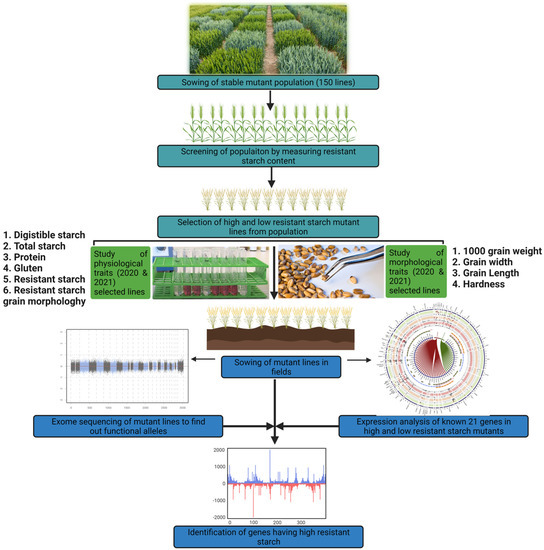 In the present study, the EMS stable population was screened, whose parent variety was J411; it showed variation for resistant starch content. This stable population consisted of one hundred and fifty mutant lines. Further, two high resistant mutant lines and two low resistant starch mutant lines were used to study quantitative gene expression patterns of 21 starch metabolic pathway genes during seed development. The overall workflow is given in Figure 1.