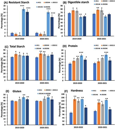 Firstly, two high resistant starch lines (JE0146 and JE0296) and two low resistant starch (JE0244 and JE0213) lines were selected after screening the mutant population. These lines showed a significant difference from WT (J411) whose value was 1.2% in 2019–2020 and 2020–2021 (Figure 2). In both years, the highest resistant starch was in JE0146; its value was 16.5% and 15.3% in 2020 and 2021, respectively. Similarly, in both years, the digestible starch of JE0146 and JE0296 was lower as compared to WT (J411); while digestible starch was higher in low starch mutant lines. All the lines showed a significant difference in total starch as compared to J411. Similarly, for the protein content, gluten, and grain hardness, all the mutants showed a significant difference in both years of data as compared to J411 (Figure 2).