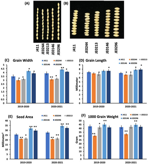 The images of high starch mutant lines and low starch mutant lines were taken to observe the length and width of the mutant lines (Figure 3). The grain width of the high starch mutant lines was significantly higher than J411; in which, the width of JE0146 was 7.2 mm and 7.6 mm in 2020 and 2021, respectively; while the width of JE0296 was 7.9 mm and 8.1 mm in 2020 and 2021. The grain length of the low resistant starch was lower as compared to J411; while it was higher for the high resistant starch mutant line JE0296, which was significantly higher than J411 (Figure 3). The thousand-grain weight of the high resistant line “JE0146” (43.2 g and 44.6 g in 2020 and 2021, respectively) was significantly higher than J411; while there was no significant difference in both years for JE0296 (Figure 3). Similarly, the 1000-grain weight (TGW) of the low resistant starch mutant lines was lower than J411. It showed a significant difference in both years’ data. In the present study, the lines that had a higher resistant starch content also showed a significant change in TGW; moreover, these lines can be used in the breeding program for the development of high resistant starch varieties (Figure 3). All the mutant lines also showed significant differences in the grain area.