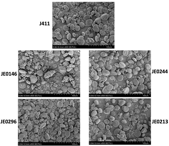 Pure starch was extracted from wheat flour; a TM4000 scanning electron microscope observed the difference in the morphology of starch granules between the wild-type (J411) and resistant starch mutants (Figure 4). The results showed that compared with the wild type, the starch granules of the mutants were reduced, morphologically shrunk, and decreased in number in the low resistant starch mutant lines (JE0244, JE0213). Similarly, in the high resistant starch mutants (JE0146, JE0296), the size of the granules is bigger than in the WT and there is an increased number of granules. The number of A-granules and B-granules were higher in the high resistant starch mutant lines as compared to J411 (WT).