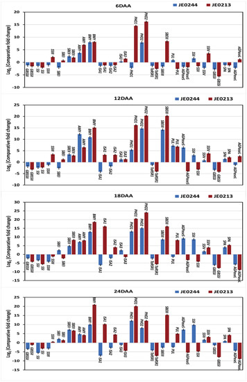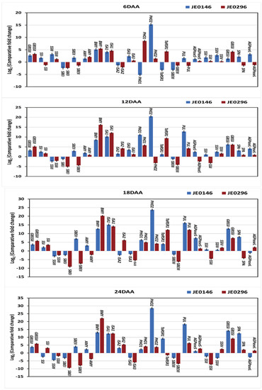 Real-time quantitative expression data (Log2 of fold change) of 21 starch metabolic genes during the seed development in the high resistant starch mutant lines, ‘JE0146 and JE0296’, in comparison to the parent variety, ‘J411’. The seed development stages were 6, 12 18, and 24 days after anthesis (DAA). All the data are represented as mean ± SD from two biological and three technical replicates.