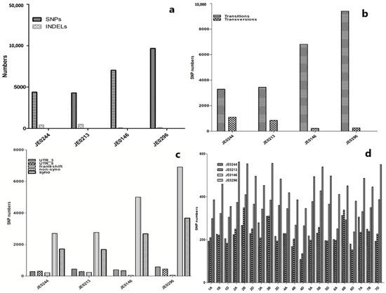 Identification of mutations in the four mutant lines (JE0244, JE0213, JE0146, and JE0296): (a) SNPs and Indels; (b) transition and transversion mutants in the four mutants; (c) Syno, Nsyno, UTR_3, UTR_5, and frameshift mutations; and (d) the number of mutations in four mutant lines in the A, B, and D genomes.