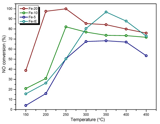NO conversion obtained for the fresh catalysts is presented in Figure 1. It can be noticed that Fe-20 exhibited the highest catalytic activity among all of the one-pot synthesized materials. The temperature of 50% NO conversion (T50) for the catalyst was around 155 °C, while at 175 °C almost 100% of NO was eliminated. On the other hand, Fe-10 and Fe-5 showed significantly lower catalytic activity. In general, NO conversion of the materials in the whole temperature range can be ordered as: Fe-5 < Fe-10 < Fe-20. Therefore, the high iron content in the zeolite did not determine satisfactory activity of the catalysts. Additionally, T50 of Fe-10 and Fe-5 were 220 and 250 °C, respectively. Thus, the increased amount of Fe in the catalysts declined their low-temperature SCR activity. Interestingly, in the case of Fe-20 and Fe-10, NO conversion remained stable within 300–450 °C. Similar result can be observed for Fe-5, however, the activity of this sample gradually decreased between 400 and 450 °C. Additionally, below 300 °C, one-pot synthesized Fe-catalysts showed considerably higher NO conversion than Fe-IE. The reference sample prepared by ion-exchange exhibited catalytic activity characteristic for the materials with iron introduced by the post-synthesis methods. T50 of the sample oscillated around 250 °C and was almost as high as that of Fe-5. Therefore, one-pot synthesis contributed to low-temperature activity of the investigated Fe-zeolite catalysts.