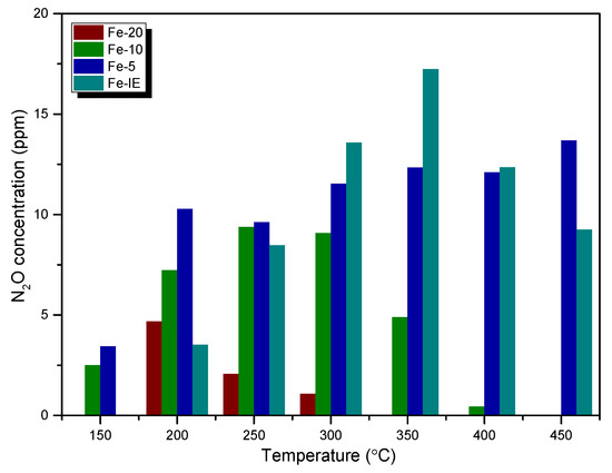 The concentration of N2O (a common by-product of NH3-SCR) at the reactor outlet is another important factor, measured during the catalytic reaction. It can be noticed from Figure 2 that the emission of N2O did not exceed 20 ppm for any of the catalysts. However, for one-pot synthesized samples it increased linearly with Fe loading and the lowest N2O yield was obtained for Fe-20. The emission of the considered by-product for this sample was detected only within 200–300 °C, probably as the result of non-selective reactions occurring during decomposition of NH4NO3 below 260 °C [45]. N2O production decreased with the increasing temperature for Fe-10 as well, however, it was observed between 250–400 °C. This effect can be explained by the possible decomposition of nitrous oxide over the FexOy clusters, present in the material (see XPS and UV-vis results) [46]. On the contrary, the N2O yield for Fe-5 was maintained at a similar level throughout the examined temperature range and was the highest among the one-pot synthesized catalysts. Interestingly, for Fe-IE, the concentration of N2O was considerably higher than that of the other samples in the high-temperature range of SCR. This result can be related to the side reaction of ammonia oxidation on the active sites of the catalysts [47].