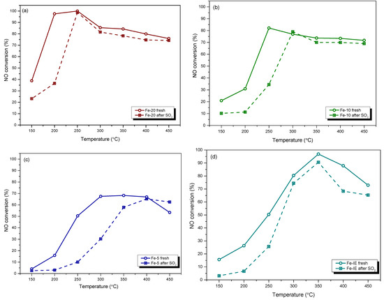 NO conversion obtained for the fresh and SO2-poisoned catalysts: (a) Fe-20; (b) Fe-10; (c) Fe-5; (d) Fe-IE.