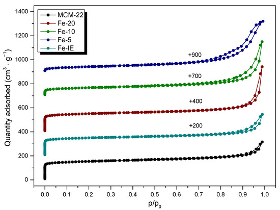 Nitrogen adsorption-desorption measurements were performed to investigate textural properties of the materials. The obtained results are presented in Table 3, while the isotherms are depicted in Figure 5. The adsorption-desorption branches exhibited by non-modified MCM-22 and the reference sample, Fe-IE were of type I (b), according to IUPAC classification, with a very narrow hysteresis loop of H4. The isotherms contained characteristic, sudden increase of the adsorbed N2 at very low p/p0, caused by the microporous structure of the materials [50]. Furthermore, the formation of hysteresis loop at p/p0 of ca. 1 indicated the presence of secondary slit-shaped mesopores or narrow macropores created by aggregated zeolite crystals [34,37,41,51]. Additionally, the uptake in N2 adsorption, observed in the range of 0.8 < p/p0 < 1.0 is related to the stacked holes between the layers [37]. It was observed that for one-pot synthesized Fe-catalysts, the shapes of the isotherms were determined by iron loading. For Fe-20, it remained almost unchanged in the p/p0 range of 0–0.9. The noticeable increase of N2 adsorption above this region resulted in the transformation of the hysteresis loop to H3, which points to the formation of non-rigid aggregates of plate-like particles [52]. The same effect was observed in the case of hysteresis loop of Fe-10. However, the sample showed significantly lower N2 adsorption capacity at very low values of p/p0, thus, lower contribution of microporosity, confirmed by the data presented in Table 3. The isotherm of Fe-5 was the most distinct among all of the materials. It can be classified as type IV(a), given normally by mesoporous materials, such as mesoporous molecular sieves. The hysteresis loop for the sample is a mixture of H3 and H5, associated with the presence of macropores and partially blocked mesopores, respectively [52]. The obtained effect probably results from the deposition of large aggregates of Fe2O3 present within pore openings of Fe-5. Importantly, the shape of the isotherms exhibited by Fe-10 and Fe-5 was additional confirmation that the catalysts cannot be qualified to the group of layered zeolites with MWW topology.