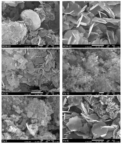 The morphology of the non-modified MCM-22 and the catalysts was investigated by SEM microscopy. It can be noticed from Figure 6 and Figure S1 that the pure MCM-22 consists mainly of the sheet-like small particles. Additionally, the sheets formed relatively regular, donut-like aggregates, which is typical for the lamellar materials [34,53,54]. Furthermore, the reference sample, Fe-IE did not show any noticeable morphological differences, comparing to the support. In contrast, introduction of Fe into the synthesis pot caused some structural changes, observed in the recorded images. The particles of Fe-20 did not form any regular aggregates and occurred in the form of scattered, small plates. However, the particle diameter of this sample did not change significantly, comparing to that of MCM-22. Additionally, in line with the results of XRD, crystallinity of the materials decreased with the decreasing Si/Fe molar ratio. The characteristic MWW layers appeared only peripherally in the case of Fe-10, while Fe-5 was almost completely amorphous.