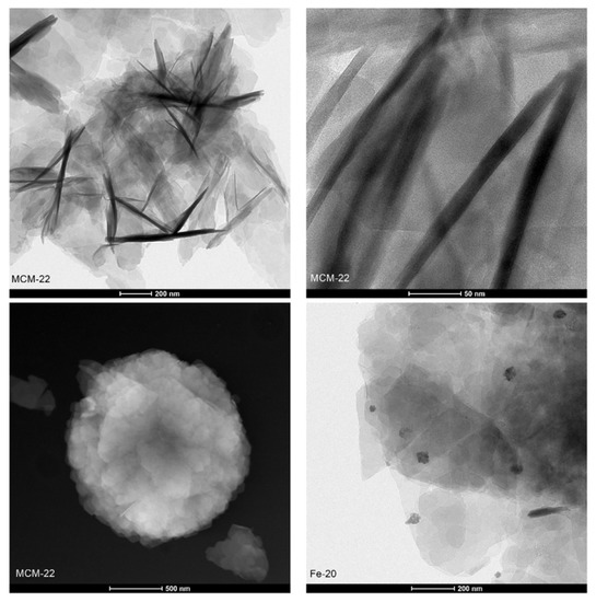 Transmission electron microscopy (TEM) allowed to investigate directly the structure of the layered precursor and the catalysts on a nanoscopic scale. The micrographs recorded for the samples in bright-field (BF), high-angle annular dark-field (HAADF), and high resolution (HR) modes are presented in Figure 7. MCM-22, Fe-IE, and Fe-20 showed a plate-like morphology, due to the presence of ordered, piled MWW-type layers. The layers formed nanoscale crystallites, which can be distinguished into the regular arrays of the exposed 0.7 × 0.7 nm cups and the 10-ring channel system, when the individual layers are parallel to the microscope’s optical axis (see HR-TEM images). Additionally, although Fe-10 did not show the typical MWW crystal structure (according to XRD results), some individual layers can be distinguished in HR-TEM image of the material. However, as predicted, the structure of Fe-5 was not characteristic for the layered zeolites.
