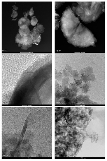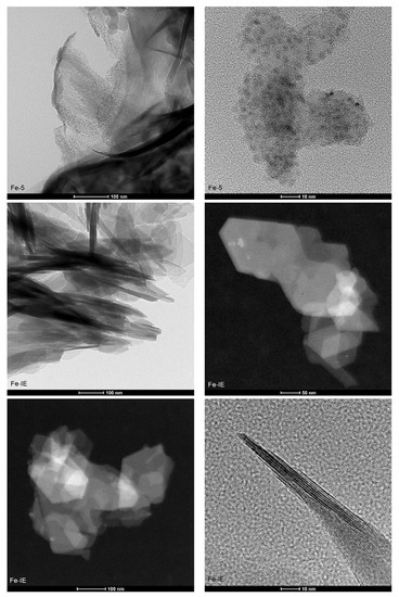 Another benefit of TEM microscopy is that it enables analysis of the active phase introduced into the catalysts. Both Fe-20 and Fe-IE exhibited very well-dispersed iron species, visible in the HAADF images. Any agglomerated clusters were found while HR-TEM mode was applied, thus, iron in the materials had beneficial distribution for NH3-SCR. In contrast, Fe-10 and Fe-5 were abundant in bulky iron agglomerates, which contributed to the loss of crystallinity and restricted formation of the plate-like structure of the materials. The analysis of the samples by TEM microscopy in various modes is in line with the speciation of iron identified by the means of UV-vis spectroscopy.
