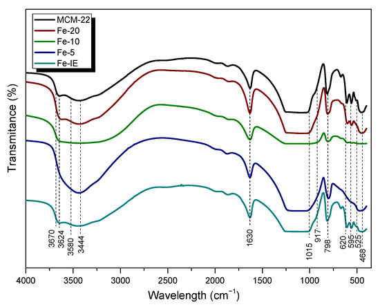The characteristic skeletal vibrations of the investigated materials were analyzed by FT-IR spectroscopy. The results depicted in Figure 8 showed that the spectra obtained for samples with Fe loadings of 0–6 wt.% are very similar. The peaks appearing in the wavelength range of 1300–400 cm−1 correspond to the vibrations of zeolitic framework [55]. The bands at 595 cm−1 and 525 cm−1, detected for MCM-22, Fe-20, and Fe-IE are assigned to the double-six-ring (D6R) of the MWW zeolite structure [51,56]. The absence of these peaks in the case of Fe-10 and Fe-5 points at some interruptions during the formation of the characteristic layered structure, caused by the excessive iron loading. Additionally, the presence of the band of asymmetric internal vibrations of T–O (where T = Si or Al) at 1015 cm−1 can be considered as the proof of the presence of Fe in all of the catalysts, except of Fe-5 [51,56].The absorption bands appearing for all of the samples at 798 and 917 cm−1 can be assigned to the stretching vibrations of SiO42− tetrahedra, while those detected at 525 and 468 cm−1 are be attributed to Al–O–Si and Si–O–Si bending vibrations, respectively. Another peak, at 620 cm−1 corresponded to the out-of-plane coupled vibrations of Al–O and Si–O [57]. Furthermore, the sharp peak at 1630 cm−1, appearing for all of the samples, confirmed that the materials contained physisorbed, structural water molecules [58]. It was observed that the shape of the spectra in the wavelength range of 4000–3000 cm−1, ascribed to the vibrations of OH groups, was strongly influenced by iron loading. All of the samples, except of Fe-5 exhibited characteristic peak at 3670 cm−1, assigned to Al-OH vibrations. The small band at 3624 cm−1 results from the Brönsted acidic sites Si(OH)Al, located in the supercages in 10-MR channels [59,60]. On the other hand, very weak band at 3580 cm−1 appeared due to the small fraction of Si(OH)Al species, located at the hexagonal prisms [61]. The peak at 3444 cm−1 is a confirmation of the hydrogen-oxygen bonds in OH groups [62].The different shape of the spectrum of Fe-5 in this wavelength region proved that the formation of zeolitic framework was significantly affected while Fe loading was ca. 15 wt.%.