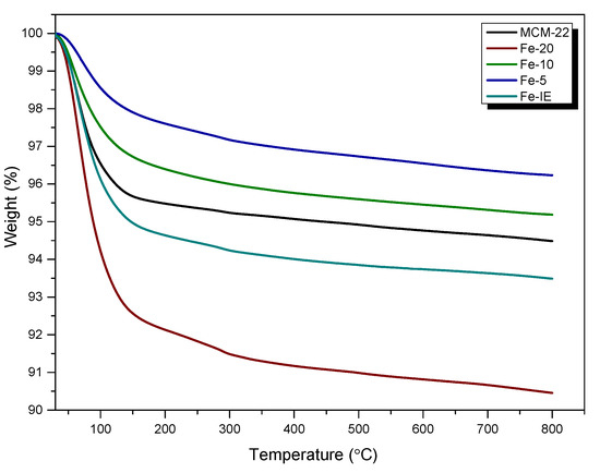 Thermogravimetric analyses (TGA) of non-modified MCM-22 and the catalysts were carried out to determine their stability within 30–800 °C. The obtained TG curves are presented in Figure 9, and the calculated weight loss in the particular temperature regions are listed in Table 4. From the presented data, it can be assumed that the weight loss for any of the materials did not exceed 10% in the analyzed temperature region. Thus, the samples showed satisfactory thermal stability, which can be ordered as it follows: Fe-20 < Fe-IE < Fe-10 < Fe-5. Additionally, the absence of a noticeable weight loss of the samples above 300 °C proved that all of the organic precursors used during the preparation procedure were successfully removed. The decrease in weight, exhibited within 30–150 °C is related to the removal of moisture [53]. Interestingly, all of the catalysts prepared by one-pot synthesis showed similar behavior to the reference sample, Fe-IE. Additionally, the lowest weight loss observed for Fe-5 could be related to the deposition of bulky particles of Fe2O3, which hampered the migration of water molecules located in the internal structure of the zeolite. On the other hand, the noticeable difference between the stability of Fe-20 and other catalysts suggests higher concentration of the adsorbed water molecules, which could result from the adsorption of H2O on the isolated Fe3+ cations incorporated into the zeolitic framework.