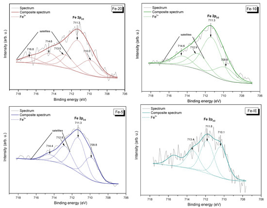 The results of XPS were analyzed (after appropriate subtraction of the linear background) using a Gaussian fitting procedure. It can be observed from Figure 10, that the peaks appearing at the lowest binding energy are located at around 709.8–710.1 eV (depending on the sample). This result confirmed the presence of Fe3+ species in the samples [63,64]. Furthermore, all of the materials exhibited satellites, sensitive for Fe oxidation state, located in the higher binding energy range. It must be added that the peaks ascribed to iron were broad (up to 6 eV), indicating that Fe was present in several different environments. The observed satellites are associated with the incorporation of iron into the MWW framework and/or its presence in the extra-framework positions, which changed the characteristics of the electric field induced by the zeolitic framework. Our results are in agreement with that obtained by Milanesio et al. [65], who modified MCM-22 with copper, which similarly to iron belongs to the group of d-electronic metals. For the Fe-IE sample (with the lowest Fe content, see Table 5), only one satellite was observed, probably due to uniform distribution of iron in the inner structure of the support [66]. On the other hand, Gurgul et al. [64] claimed that lower binding energies in the XP spectra are given by the aggregates of Fe2O3. Therefore, it can be assumed that Fe-10 and Fe-5 contained a higher concentration of extra-framework iron species, such as Fe2O3 particles. Additionally, as demonstrated in Table 5, the surface concentration of Fe3+ sites in the samples followed the order of Fe-IE < Fe-20 < Fe-10 < Fe-5.