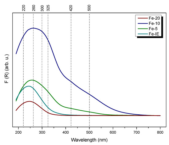 Speciation and distribution of iron in the catalysts was characterized by UV-vis-DR spectroscopy. As shown in Figure 11, the form of iron in the samples was strongly influenced by its loading. All of the catalysts showed characteristic absorption bands in range of 200–600 nm and the spectra can be divided into four regions, ascribed to different iron species. The oxygen-to-metal charge-transfer bands below 300 nm, present for all of the materials, are assigned to the isolated, monomeric Fe3+ cations in various coordination [37,42,46]. The particular position of the specific bands depends on the number of ligands. Isomorphously incorporated, tetrahedrally coordinated iron cations in Fe-silicate were confirmed by the bands at ca. 220 nm [68]. Furthermore, the peak at 260 nm suggested the presence of isolated octahedral iron cations in the samples [69]. The absorption region located around 325 nm confirmed the existence of small oligomeric FexOy species, while the band at 500 nm corresponded to bulky Fe2O3 particles, respectively [42,70]. What is important, the bands above 300 nm were absent for Fe-20. Thus, the sample was the most abundant in well-dispersed isolated Fe3+ sites. Basing on this result, it can be concluded that higher Si/Fe molar ratio provided better control of iron distribution in the catalysts. What is more, comparing to Fe-20, the reference sample, Fe-IE showed more intense absorption bands around 300 nm and above this value, which evidenced formation of polynuclear iron species in the material. Therefore, one-pot synthesis was more beneficial for the incorporation of the isolated Fe3+, comparing to ion-exchange method. As confirmed by TEM microscopy and XPS results, Fe-10 and Fe-5 contained high amount of polynuclear FexOy and Fe2O3 clusters. This effect is most clearly visible for Fe-5, which showed the most intense absorption band among all of the materials, related to the highest Fe loading. Additionally, despite both Fe-10 and Fe-5 exhibited absorption bands below 400 nm, the possibly formed Fe active centers could be partially blocked by catalytically-passive Fe2O3 particles. The obtained results suggested that iron loading in the one-pot synthesized samples directly influenced the diversity of its species and as a consequence, catalytic performance in NH3-SCR. According to Brandenberger et al. [71], the behavior of iron-modified zeolites in SCR is strongly determined by the form of Fe in the zeolitic framework. The studies proved that the monomeric Fe3+ sites had a major contribution into the SCR activity below 300 °C. The effect is caused by the lowest activation energy of around 36 kJ mol−1. Thus, the application of the one-pot synthesis method and control of the amount of the active phase can increase its activity in low-temperature NH3-SCR.