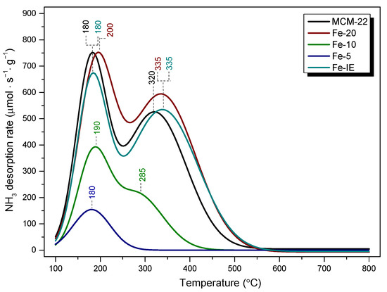 As presented in Figure 12, the investigated materials exhibited characteristic peaks within 180–200 °C and 300–335 °C, ascribed to the desorption of ammonia from weak (low temperature peaks, LTP) and medium or strong acid sites (high temperature peaks, HTP), respectively [34]. In general, the acidic character of the materials increased, following the order of Fe-5 < Fe-10 < Fe-IE < MCM-22 < Fe-20. For the pristine MCM-22, the desorption peaks are located at 180 °C (LTP) and 320 °C (HTP). The LTP could appear due to the NH4+ ion, weakly bonded to Brönsted acid sites, or due to the presence of framework and extra framework aluminum species in the zeolite. On the other hand, HTP can be assigned to the desorption of ammonium ions from the strong Brönsted sites, or NH3 molecules coordinated to Lewis acid sites [75,76]. According to the literature studies, modification with iron improves the medium and strong acidity of the zeolites by the introduction of the extra framework Fe3+ species, thus, strong Lewis acid centers [77]. Such effect could be observed only in the case of Fe-20 and the reference sample, Fe-IE. Additionally, LTP of Fe-20 was centered at 200 °C, hence, the weak acid sites of the sample bonded ammonia stronger than MCM-22 and Fe-IE. Furthermore, HTPs of both Fe-20 and Fe-IE were centered at 335 °C. Therefore, the samples contained slightly stronger acid sites of high strength than MCM-22. One can note that in contrast to Fe-IE, the intensity of LTP of Fe-20 is almost equal to that of MCM-22. These results differ slightly from those reported by Ates [75], who postulated that the density of the Brönsted acid centers decreases as the result of the exchange of Fe3+ with NH4+ cations. However, the author considered only post-synthesis modification of zeolites (ion-exchange). Therefore, our results revealed that the controlled introduction of the active phase into the synthesis pot limited the reduction of the Brönsted sites, caused by the modification with Fe. Additionally, according to Ryu et al. [78], the newly formed weak acid sites appear due to the creation of Lewis acid centers. In the case of Fe-10, LTP was shifted to 190 °C, however, the HTP, centered at 285 °C was hardly observed, since it partially overlapped with LTP. For Fe-5, LTP did not change its position, comparing to MCM-22, nevertheless, HTP completely disappeared. The observed phenomena can be explained by the fact that the majority of iron species in Fe-10 and Fe-5 was present in a form of clustered aggregates, which significantly lowered NH3 adsorption capacity of the materials. Additionally, since Fe-10 and Fe-5 did not show the characteristic frameworks of the layered zeolites (see XRD), their structures were much poorer in the acidic centers, characteristic for highly crystalline MWW materials.